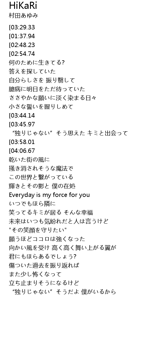 | [00:14.43][02:48.23][04:19.13] | 村田あゆみ-HiKaRi |