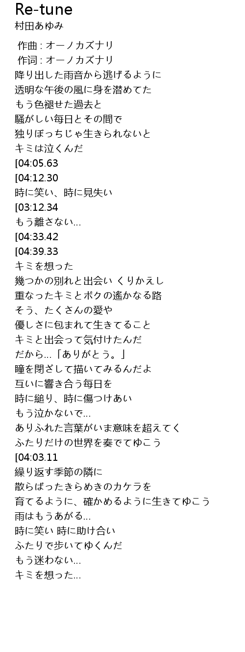 | [03:27.29] | ふたりだけの世界を奏でてゆこう |