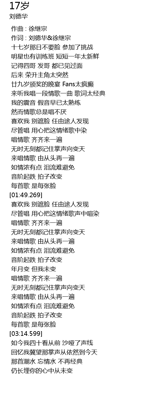 | [00:01.00] | 作词 : 刘德华&徐继宗 |