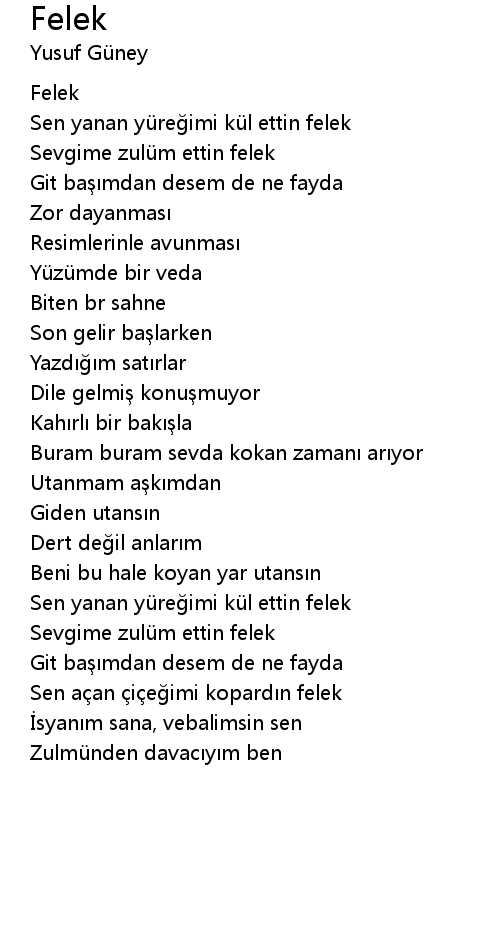 | Sen yanan yü re imi kü l ettin felek | |