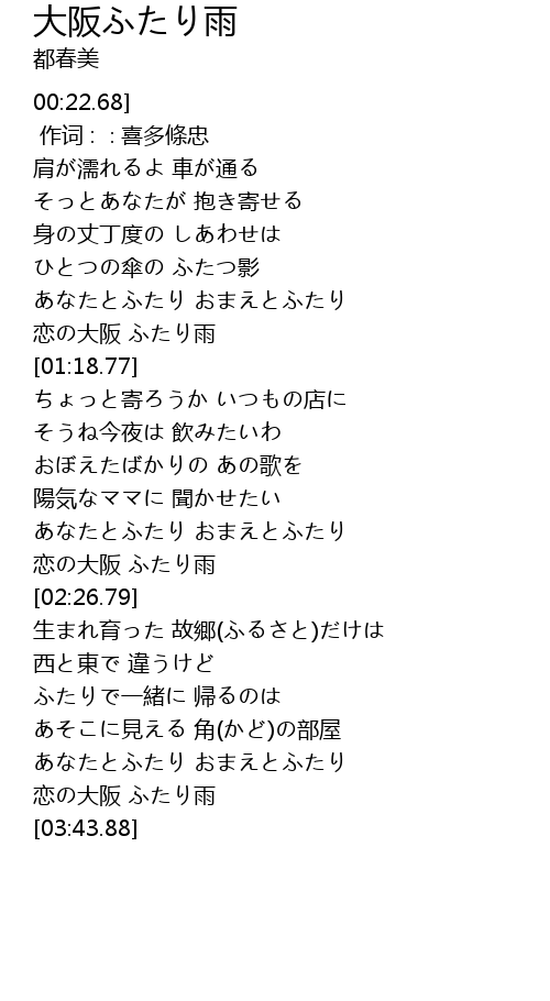 | [02:15.01] | 恋の大阪 ふたり雨 |