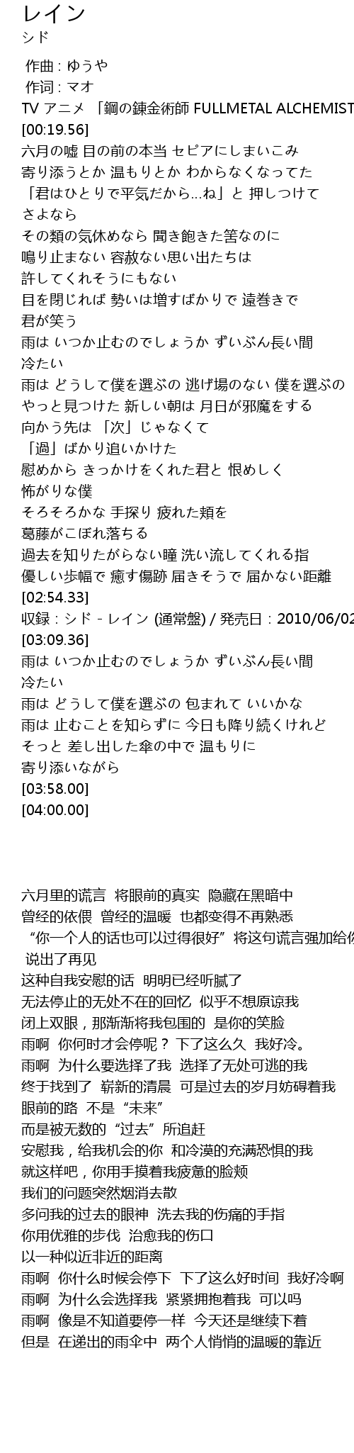 | [02:55.95] | 収録:シド - レイン (通常盤)/発売日:2010/06/02 |
