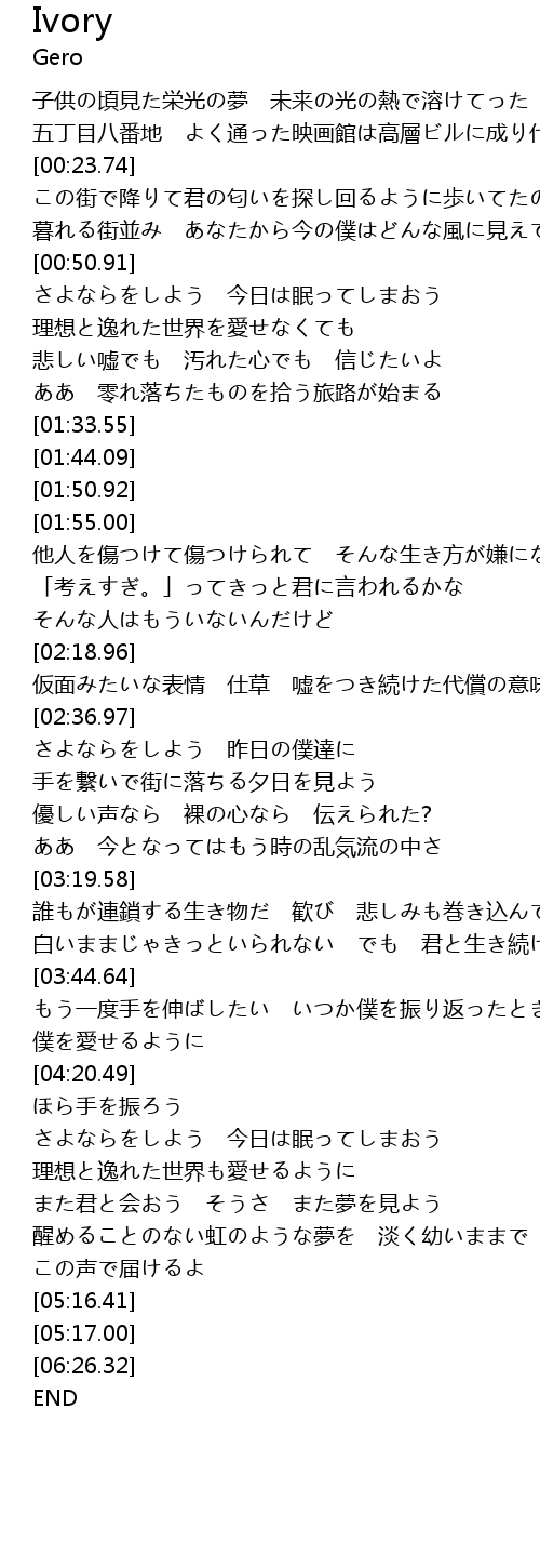 | [04:27.33] | さよならをしよう 今日は眠ってしまおう |