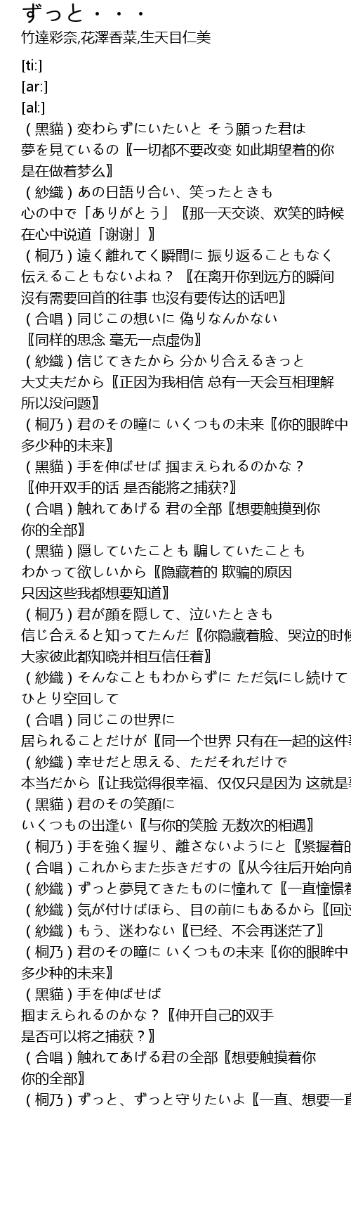 | [00:15.62] | (黑貓)変わらずにいたいと そう願った君は 夢を見ているの〖一切都不要改变 如此期望着的你 是在做着梦么〗 |
