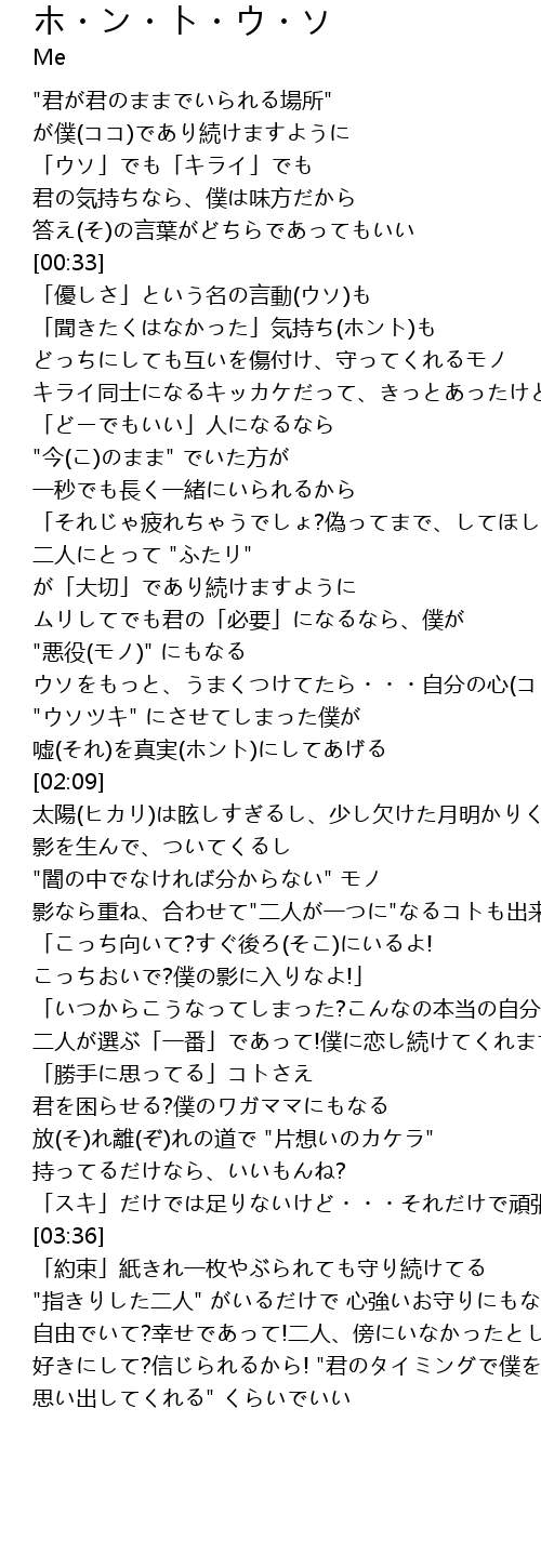 | [01:52] | ウソをもっと、うまくつけてたら・・・自分の心(コト)まで誤魔化(だま)せるくらい |