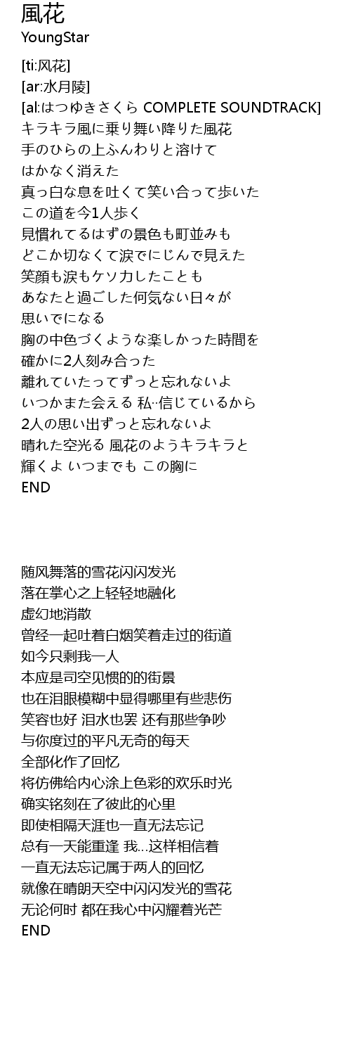 | [00:38.880] | キラキラ風に乗り舞い降りた風花 |