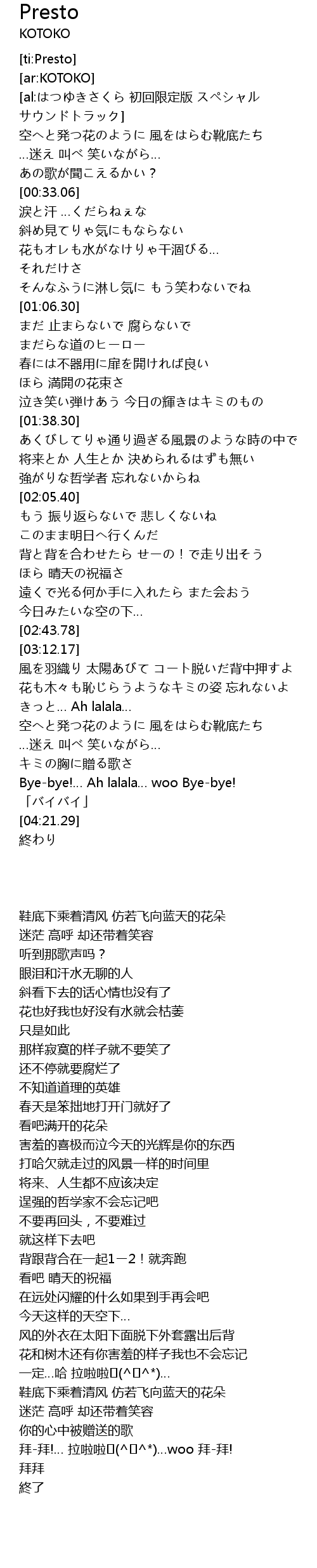 | [04:03.27] | Bye-bye!… Ah lalala… woo Bye-bye! |