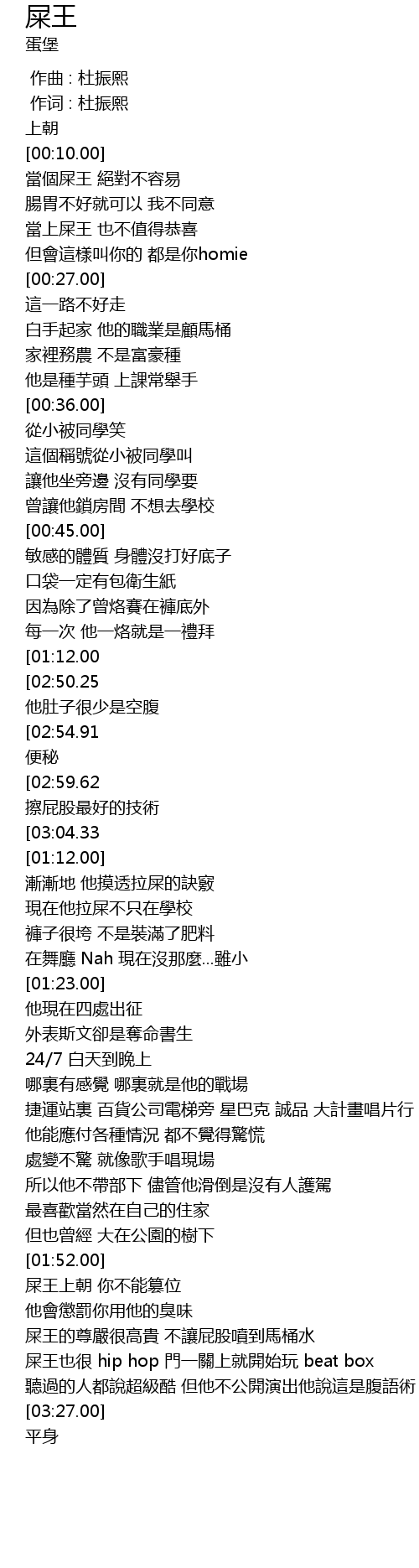 | [02:36.15] | 屎王的尊嚴很高貴 不讓屁股噴到馬桶水 |
