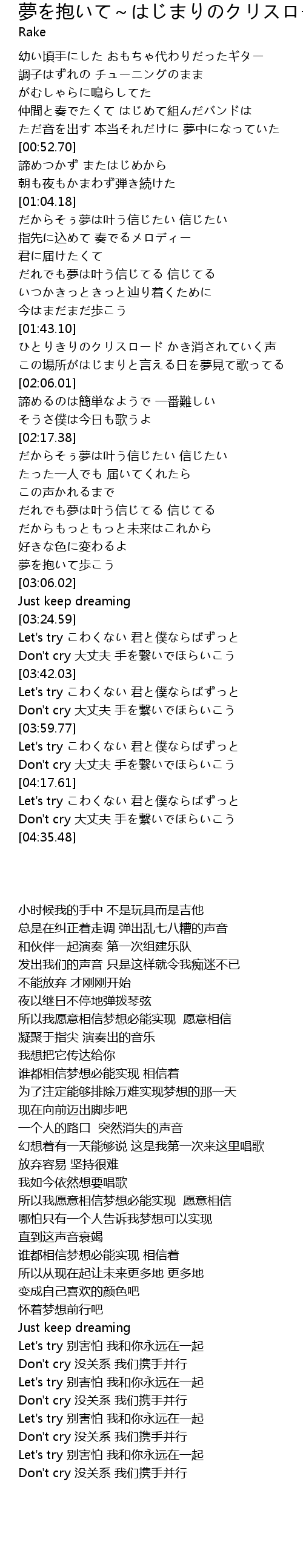 | [04:09.52] | Don't cry 大丈夫 手を繋いでほらいこう |