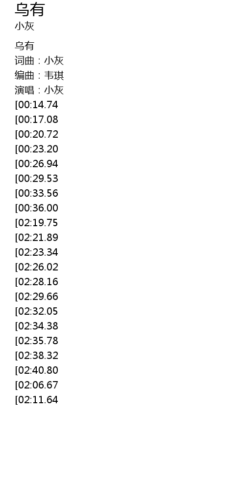 | [02:47.09][02:21.89][01:43.92][00:40.97] | 化作乌有 |