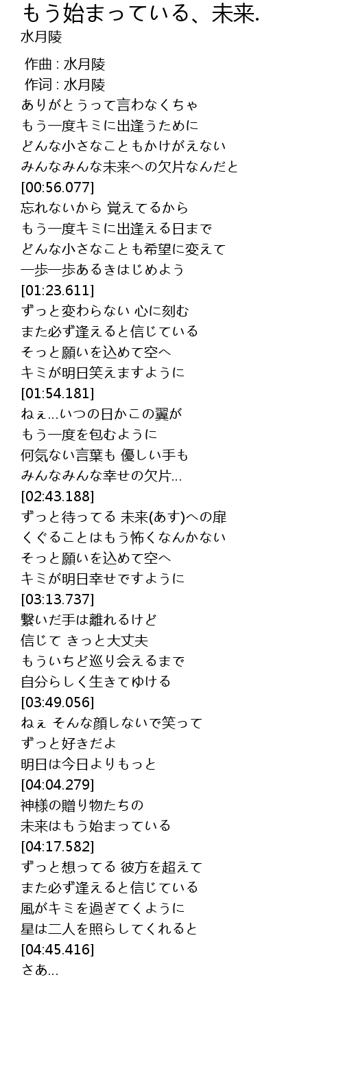 | [02:45.239] | ずっと待ってる 未来(あす)への扉 |