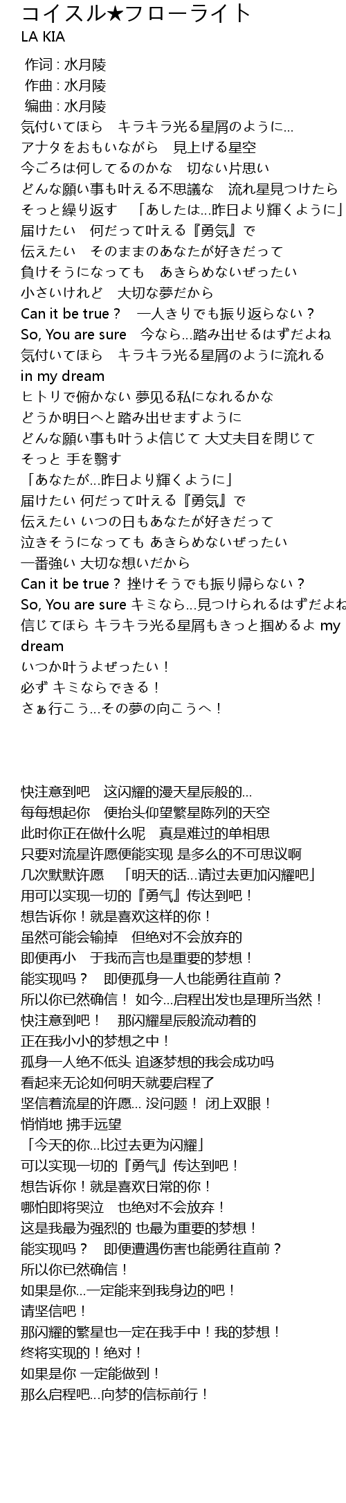 | [02:23.679] | 坚信着流星的许愿... 没问题! 闭上双眼! |