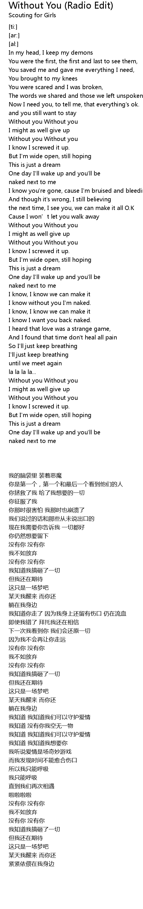 | [02:16.44] | I know without you I' m naked. |