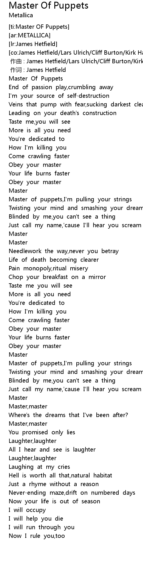 | [01:47.544] | Master of puppets,I'm pulling your strings |