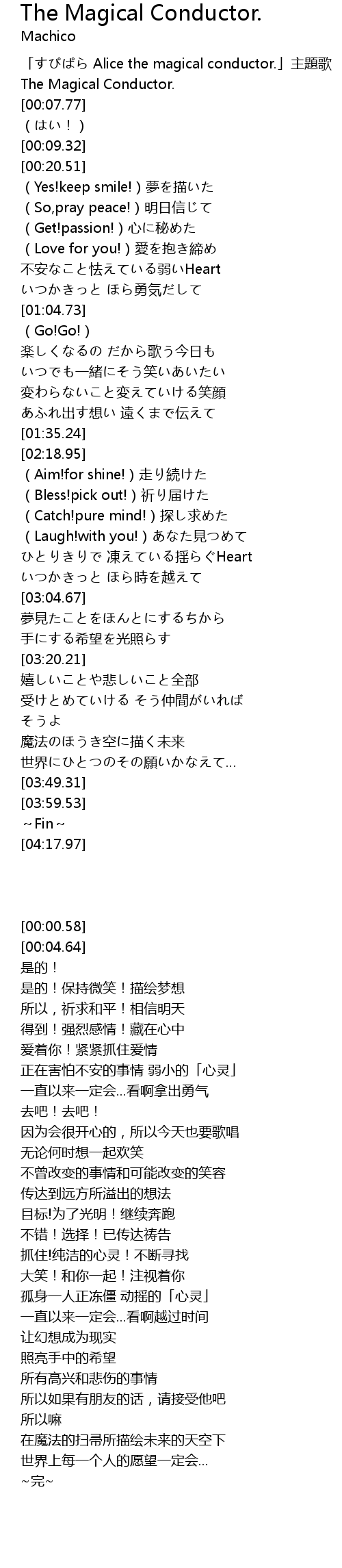 | [00:00.58] | Alice the magical conductor. zhǔ tí gē |