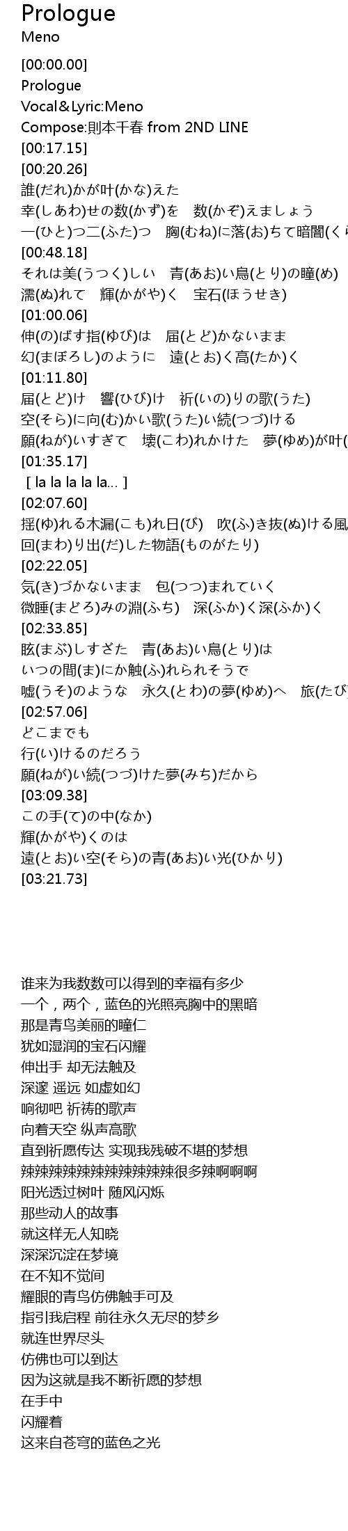 | [00:48.54] | それは美(うつく)しい 青(あお)い鳥(とり)の瞳(め) |