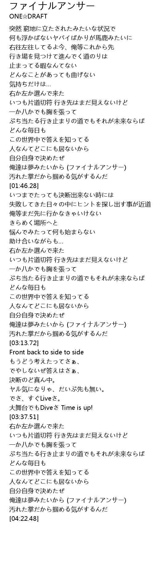| [01:34.04] | 俺達は夢みたいから (ファイナルアンサー) |