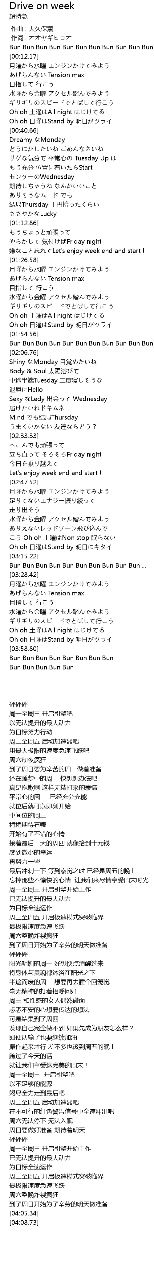 | [03:08.41] | Oh oh 日曜はStand by 明日にキタイ |