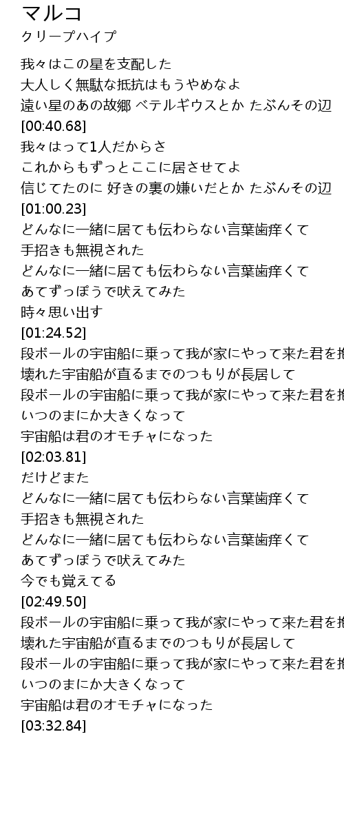| [03:23.44] | いつのまにか大きくなって 宇宙船は君のオモチャになった |