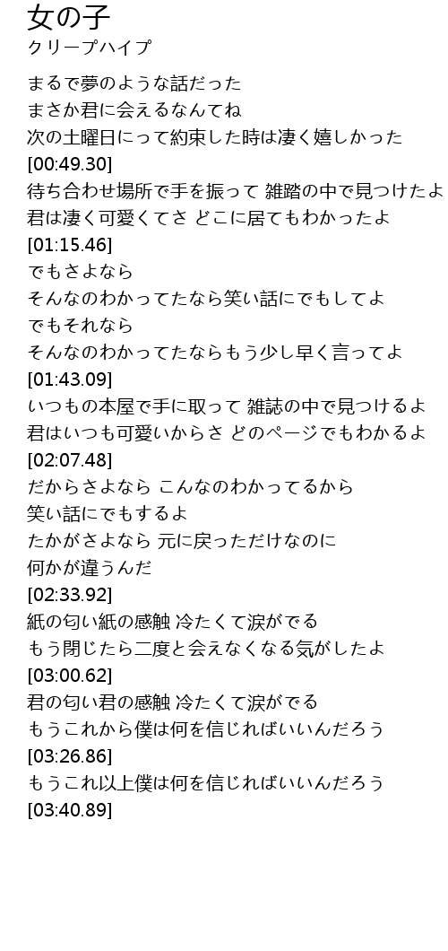 | [03:02.27] | 君の匂い君の感触 冷たくて涙がでる |