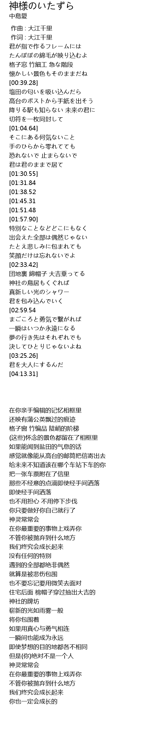 | [03:40.10][01:31.84] | 神様は時々いたずらする |