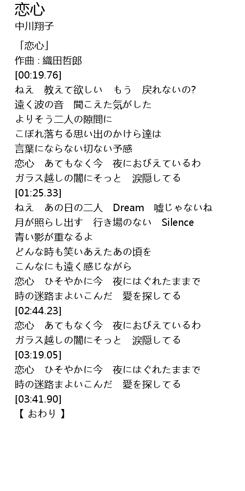 | [03:24.22] | 恋心 ひそやかに今 夜にはぐれたままで |