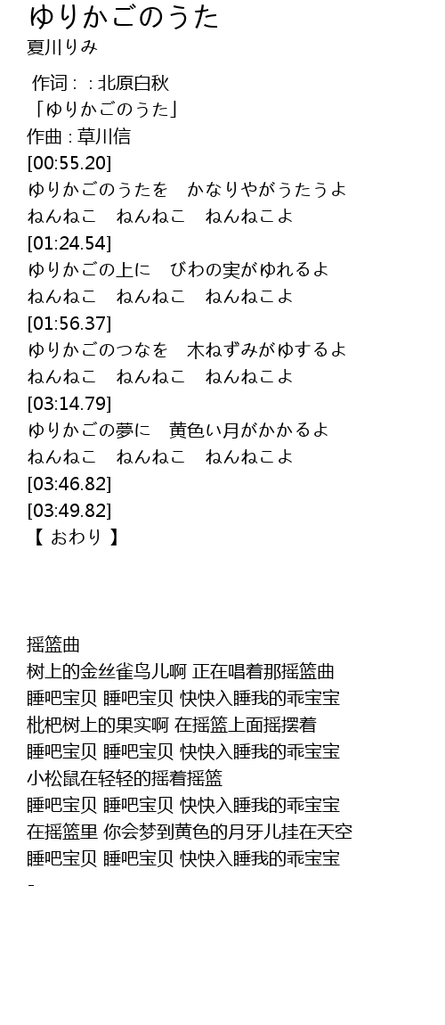 | [00:57.20] | ゆりかごのうたを かなりやがうたうよ |