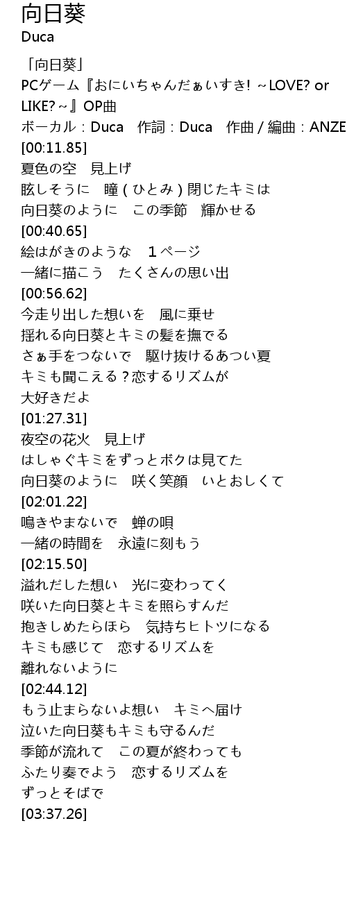 | [00:03.86] | PCゲーム『おにいちゃんだぁいすき! ~LOVE? or LIKE?~』OP曲 |