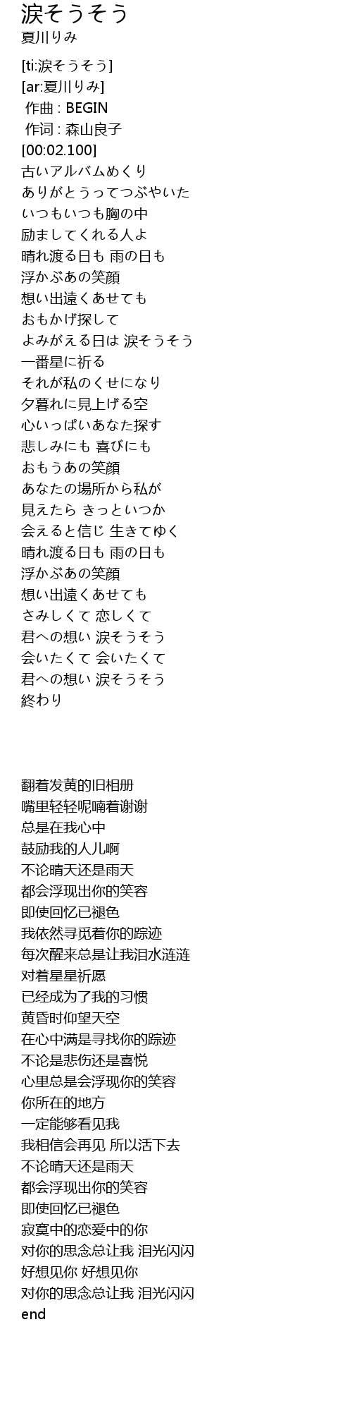 | [01:22.720] | よみがえる日は 涙そうそう |