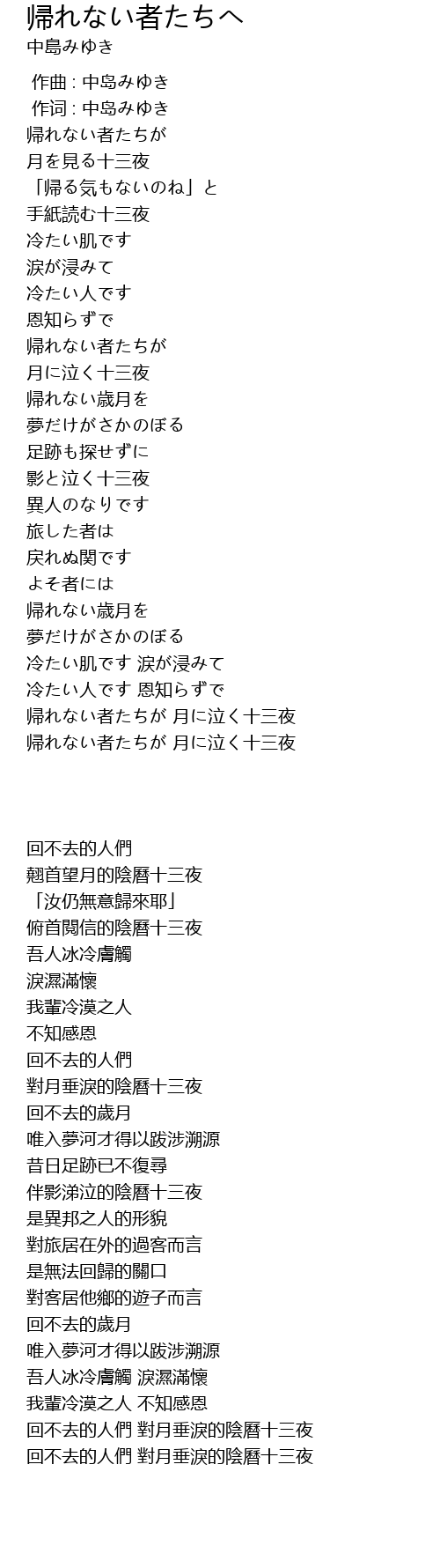 | [03:50.338] | 帰れない者たちが 月に泣く十三夜 |