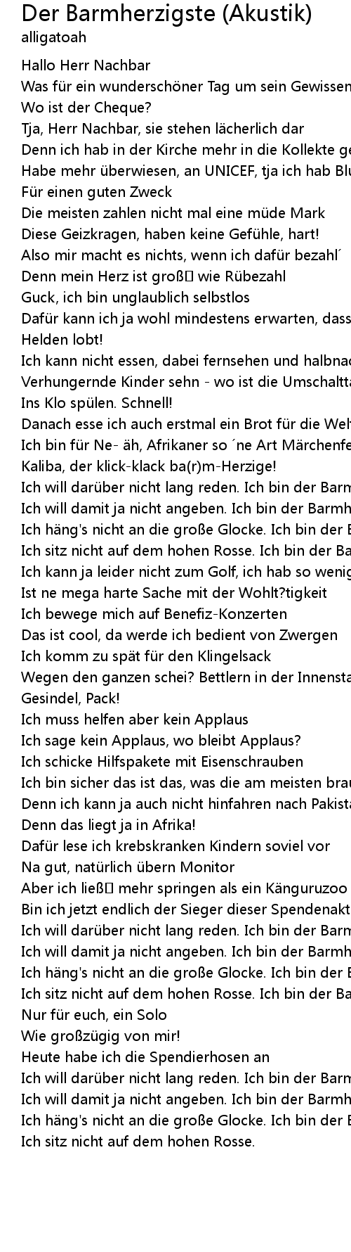 | [02:17.44] | Ich sitz nicht auf dem hohen Rosse. Ich bin der Barmherzigste! |