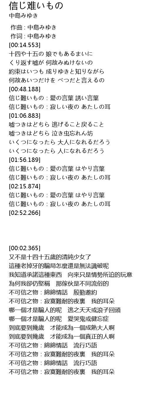 | [00:01.00] | 作词 : 中島みゆき |