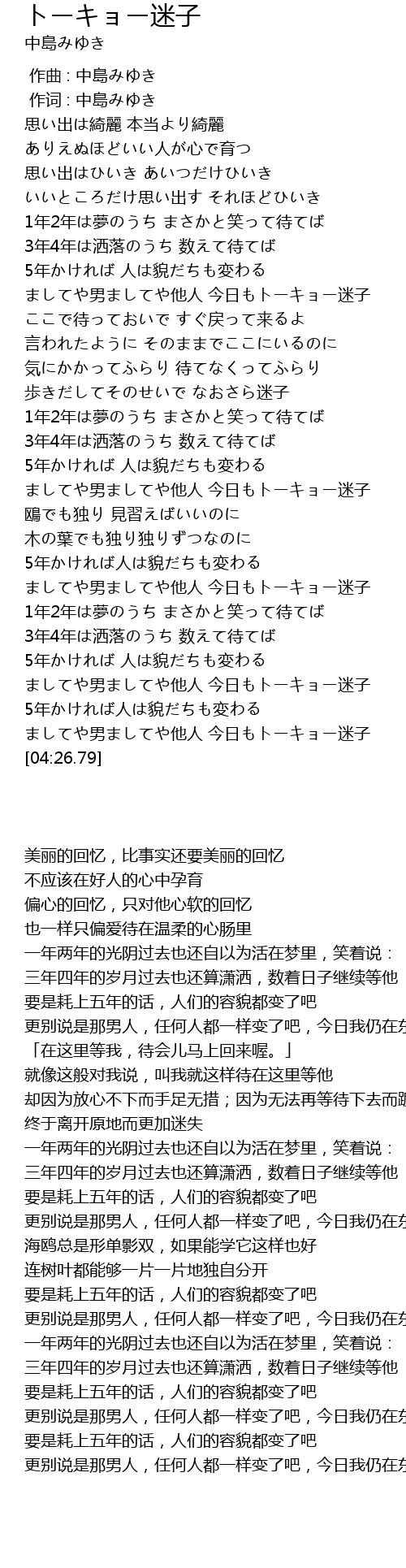 | [04:14.27] | 更别说是那男人,任何人都一样变了吧,今日我仍在东京迷失了方向 |