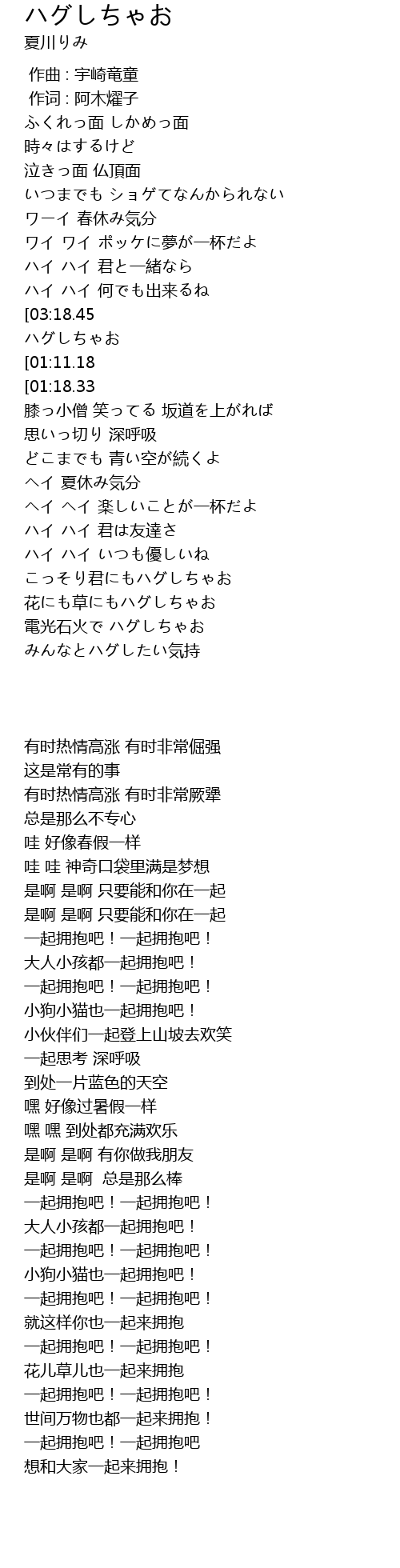 | [03:25.48][03:18.45][03:11.16][03:04.33][02:28.89][02:21.96][01:14.95][01:07.91] | ハグしちゃお ハグしちゃお |