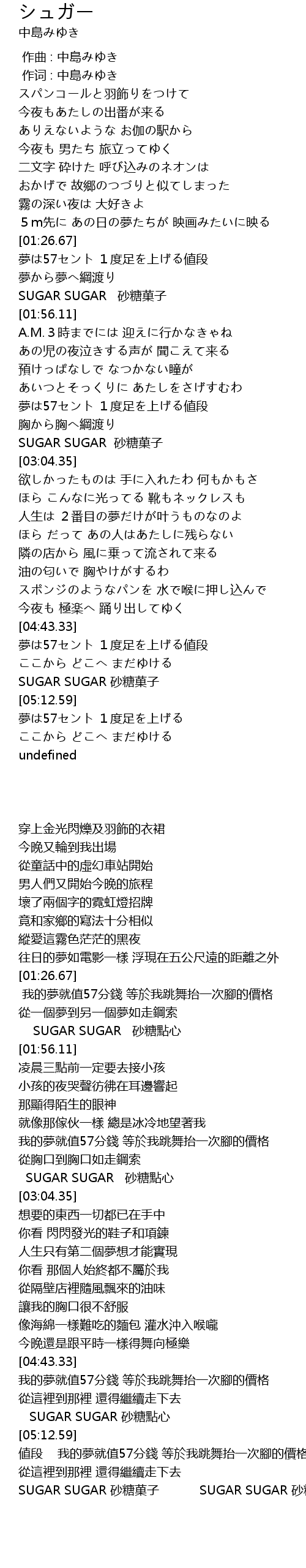 | [05:35.03] | SUGAR SUGAR 砂糖菓子 SUGAR SUGAR 砂糖點心 |