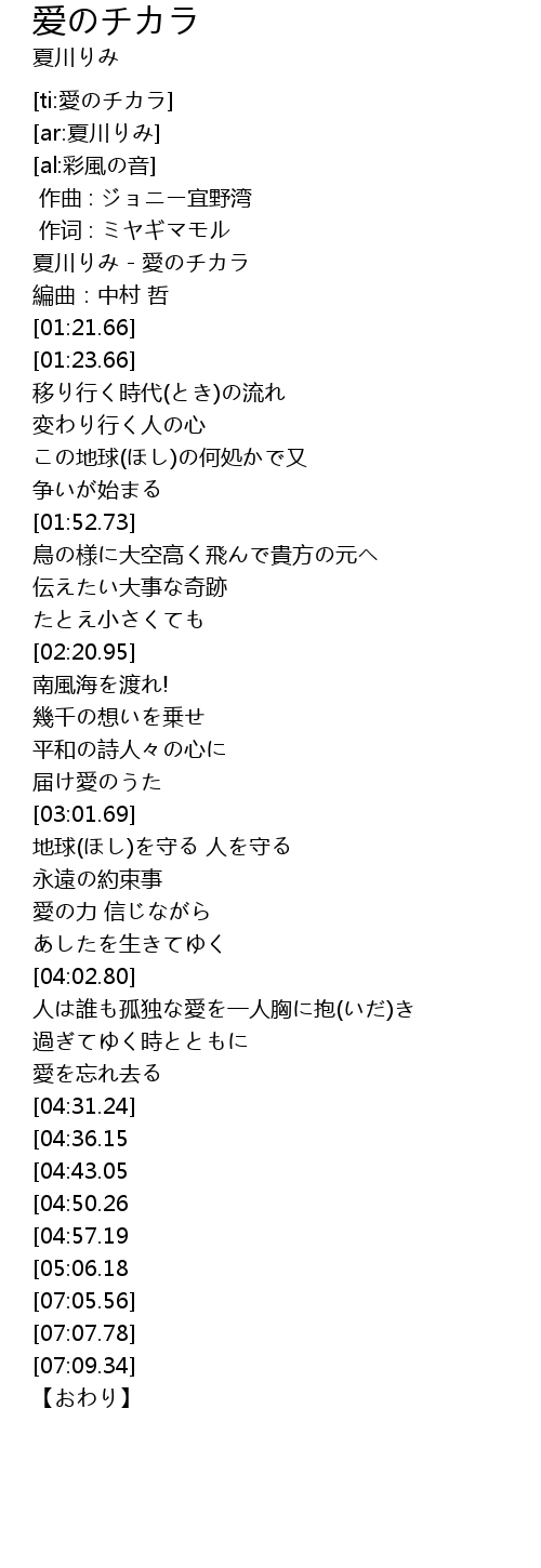 | [00:00.00] | 夏川りみ - 愛のチカラ |