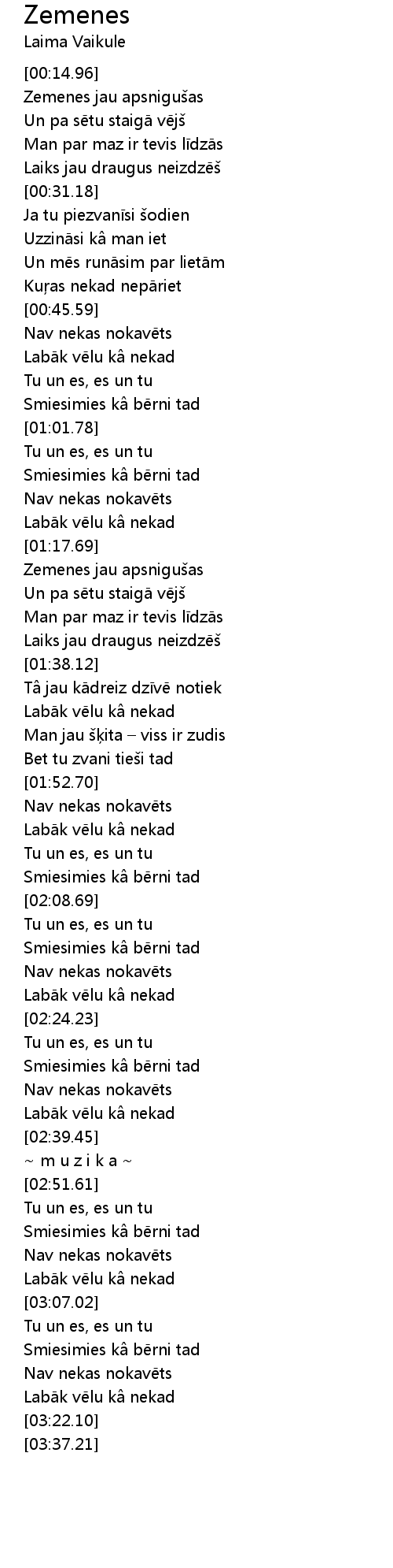 | [01:13.51] | Labāk vēlu kâ nekad |