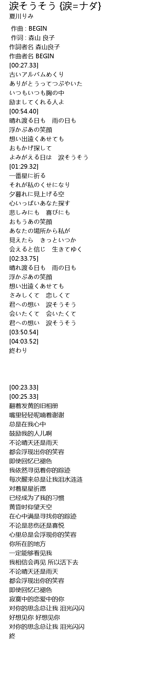 | [03:28.41] | 君への想い 涙そうそう |