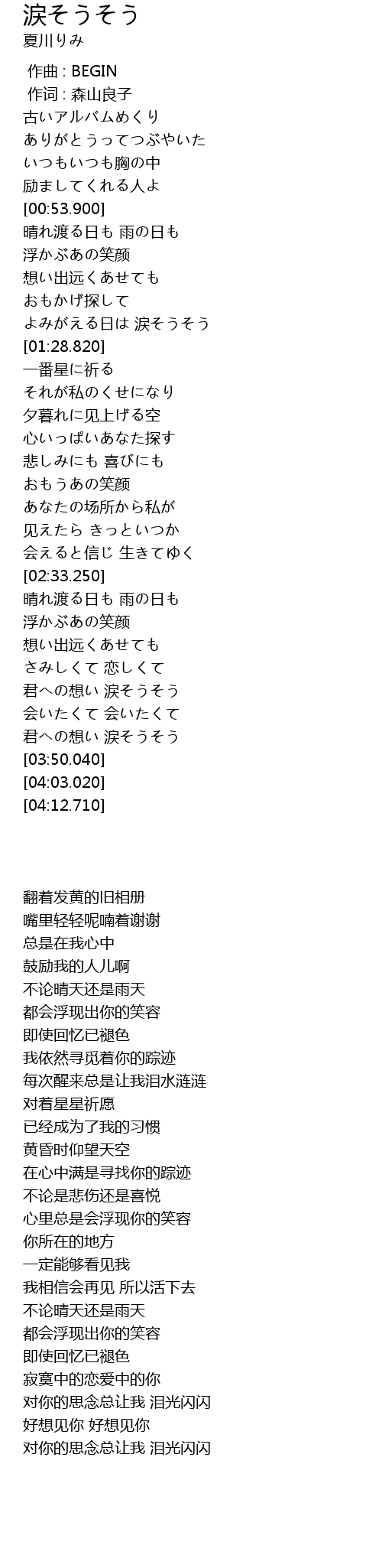 | [01:20.620] | よみがえる日は 涙そうそう |