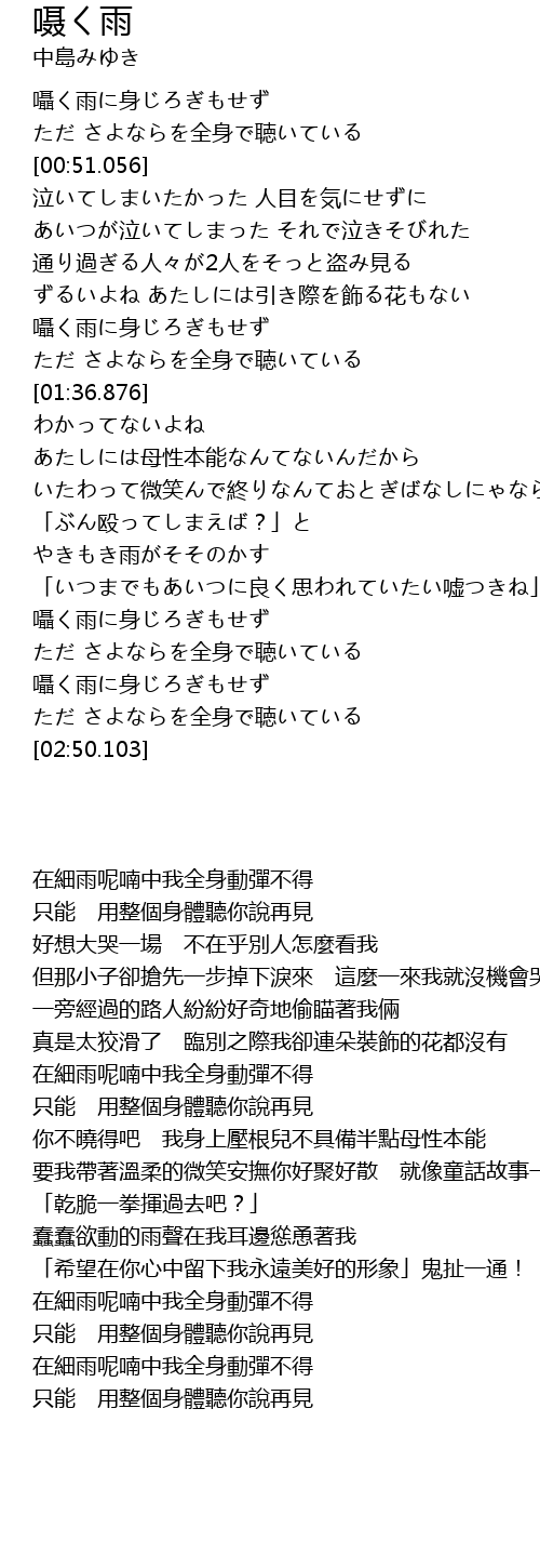| [00:51.211] | 泣いてしまいたかった 人目を気にせずに |