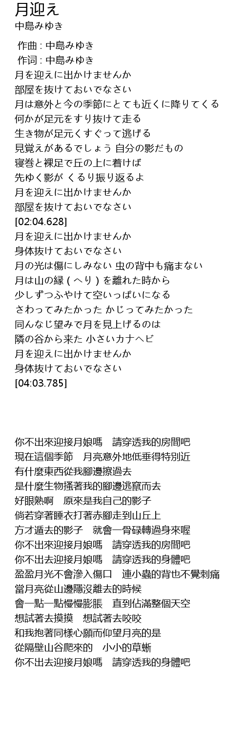 | [03:49.000] | 你不出去迎接月娘嗎 請穿透我的身體吧 |