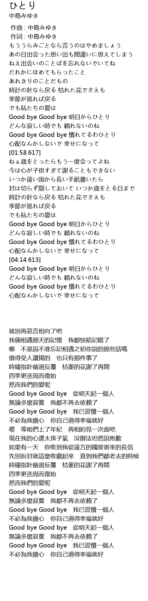 | [03:59.958] | Good bye Good bye 慣れてるわひとり |