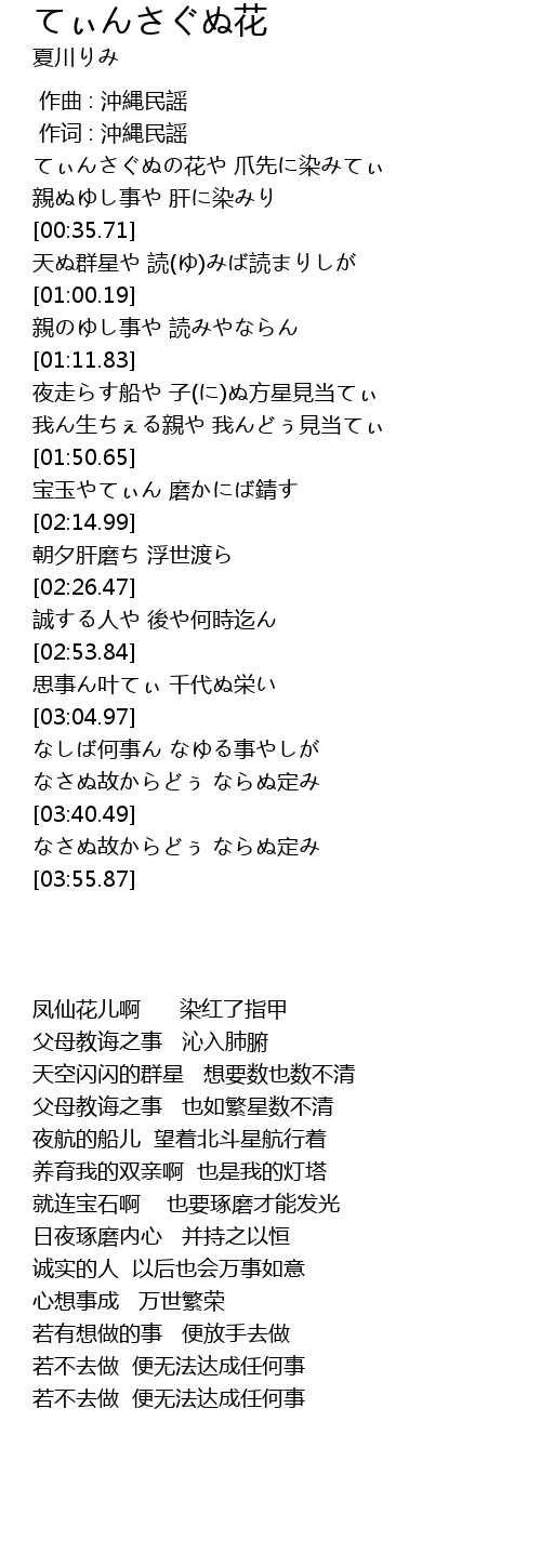 | [00:13.05] | てぃんさぐぬの花や 爪先に染みてぃ |