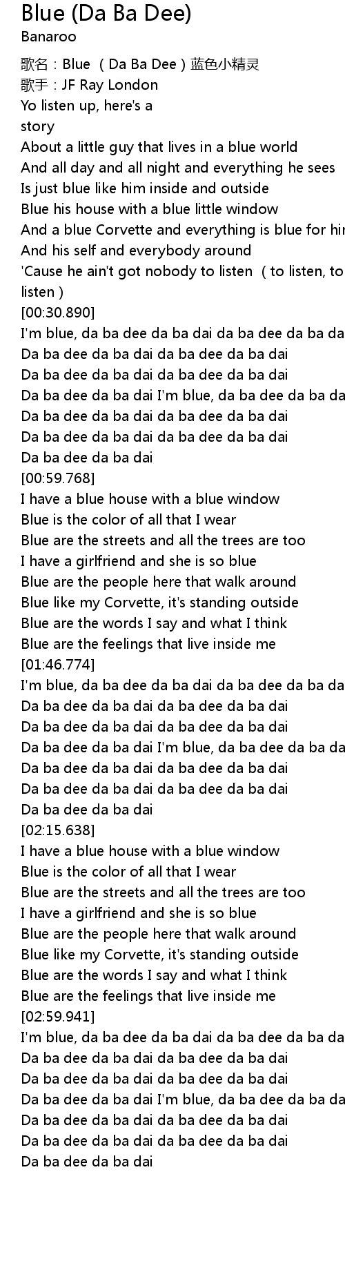 | [03:11.989] | Da ba dee da ba dai I'm blue, da ba dee da ba dai da ba dee da ba dai |
