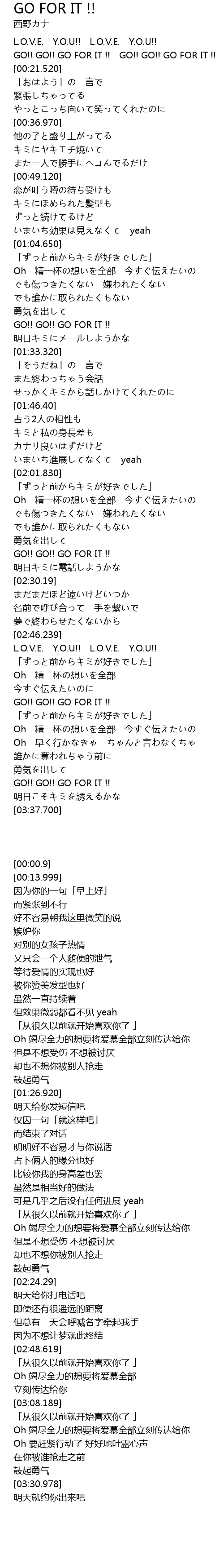 | [03:08.189] | GO!! GO!! GO FOR IT !! |