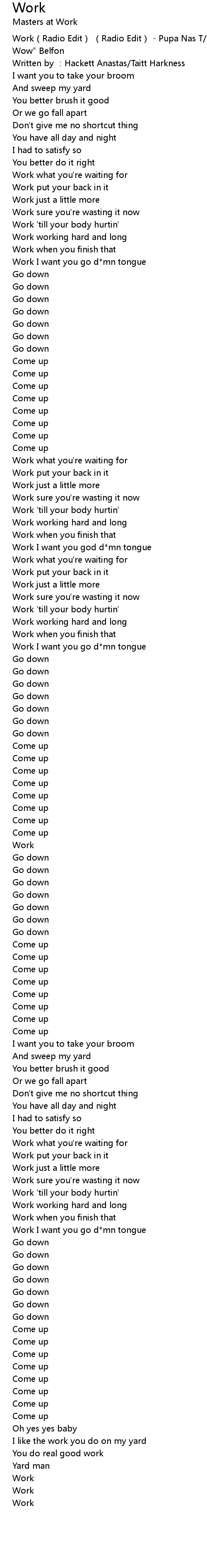 | [00:00.254] | Work Radio Edit Radio Edit Pupa Nas T Denise " Saucey Wow" Belfon |