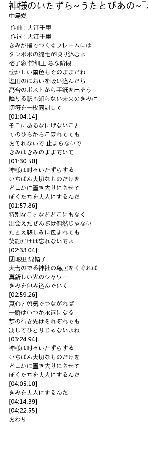 | [02:37.55] | 大吉のでる神社の鸟居をくぐれば |