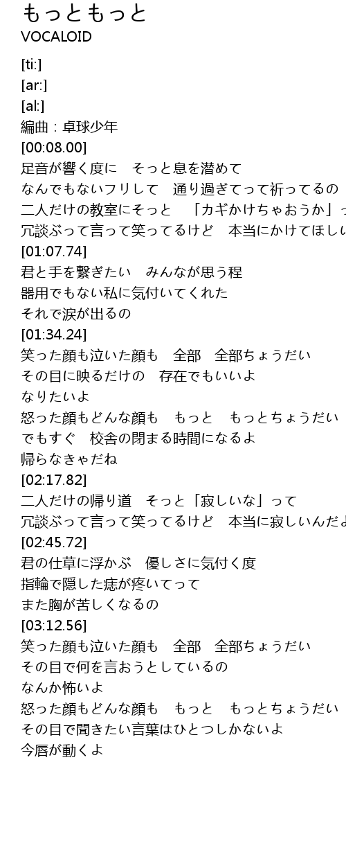 | [01:56.64] | 怒った顔もどんな顔も もっと もっとちょうだい |