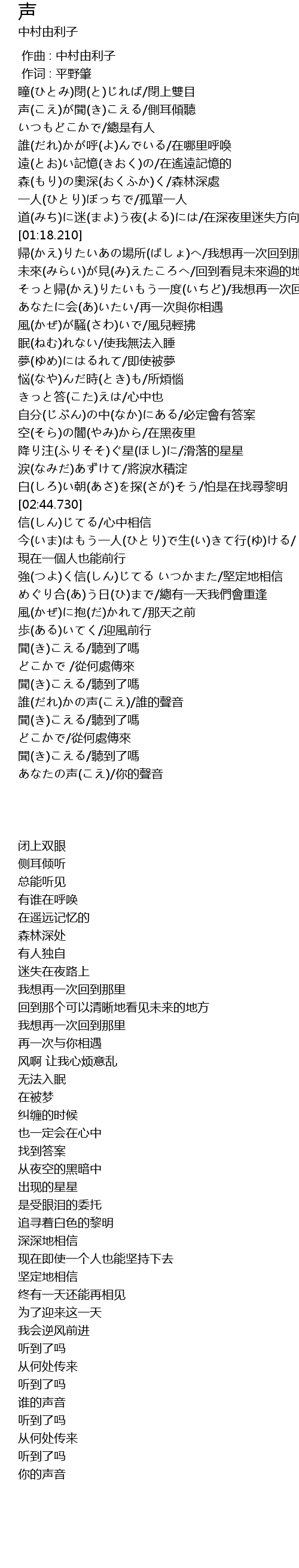 | [00:42.220] | 声(こえ)が聞(き)こえる/側耳傾聽 |
