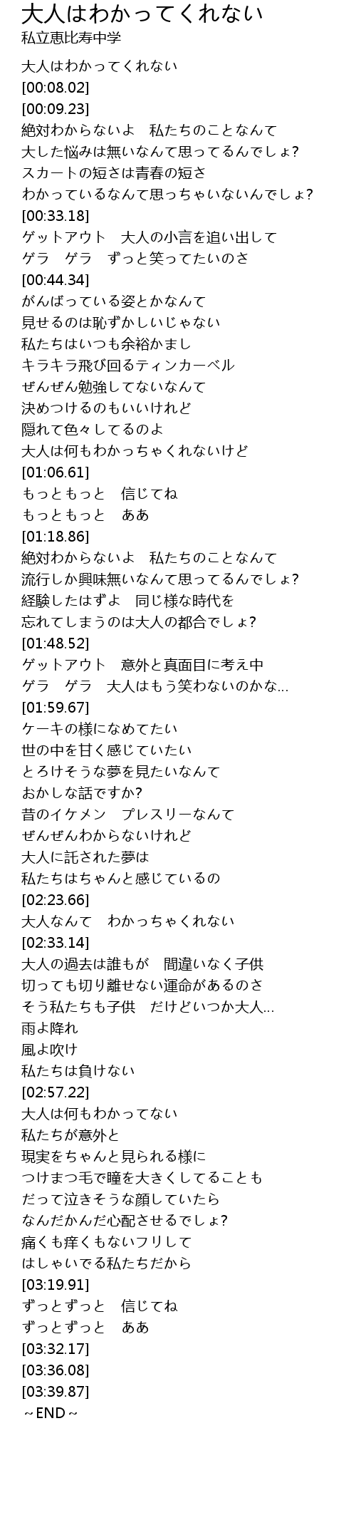 | [00:34.18] | ゲットアウト 大人の小言を追い出して |